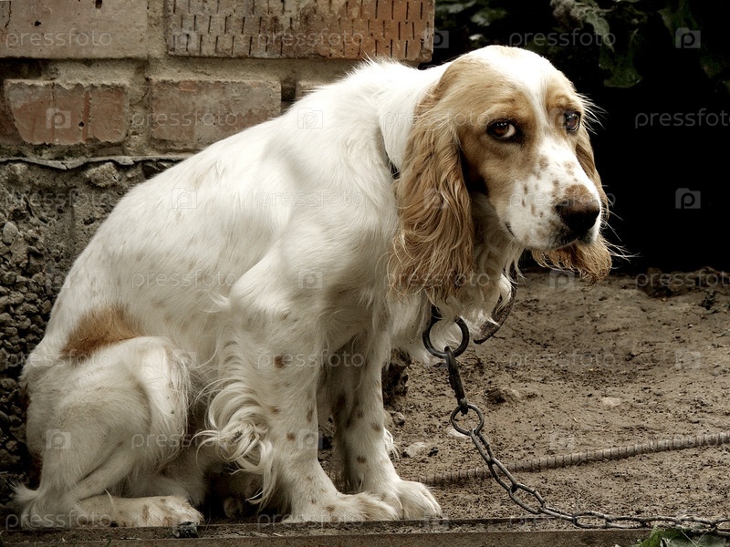 Спаниель с тоскливым взглядом, сидящий на цепи