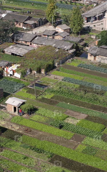 Деревня и возделанные поля на окраине города Гуйлинь, Китай