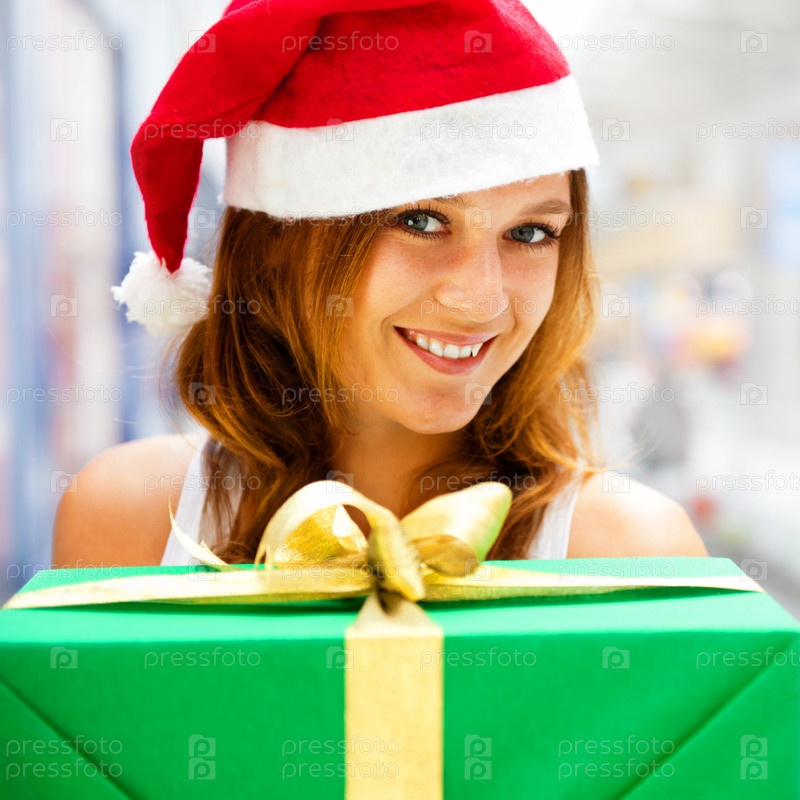 Девушка в колпаке Санта Клауса с подарочной коробкой в руках в торговом центре