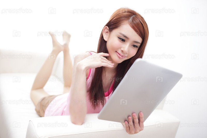 Счастливая женщина, с помощью планшетного ПК на диване