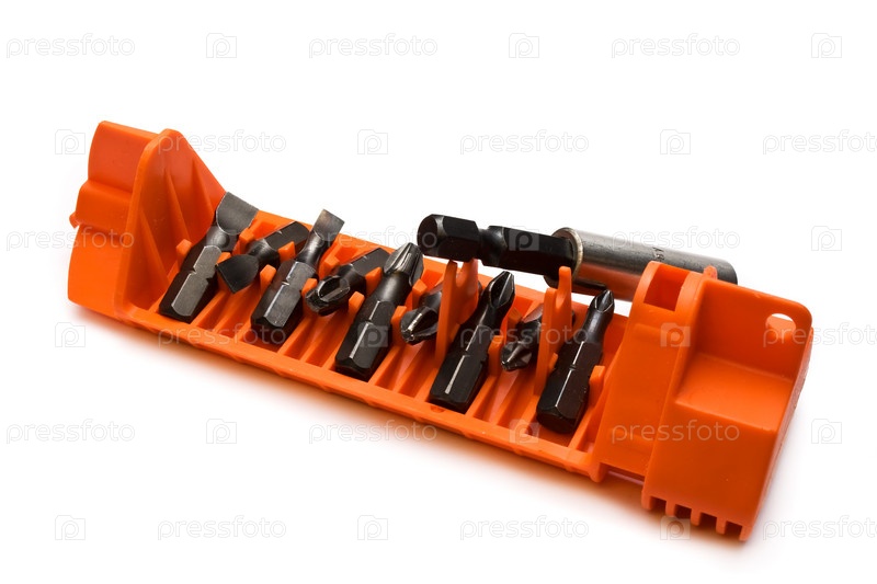 Набор наконечников отвертки на подставке, на белом фоне