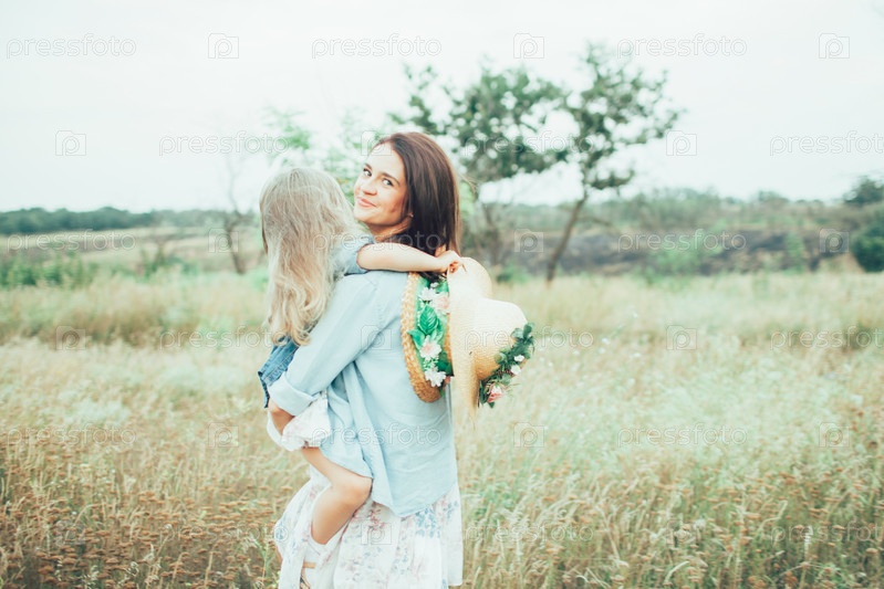 Молодая мать и дочь на фоне зеленой травы