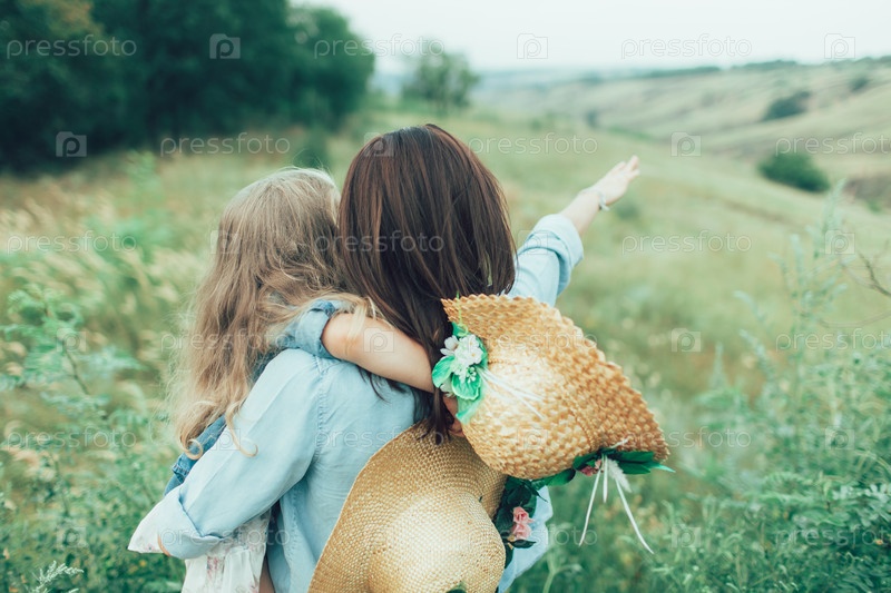 Молодая мать и дочь на фоне зеленой травы