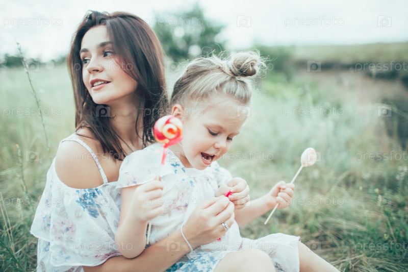 Молодая мать и дочь на фоне зеленой травы
