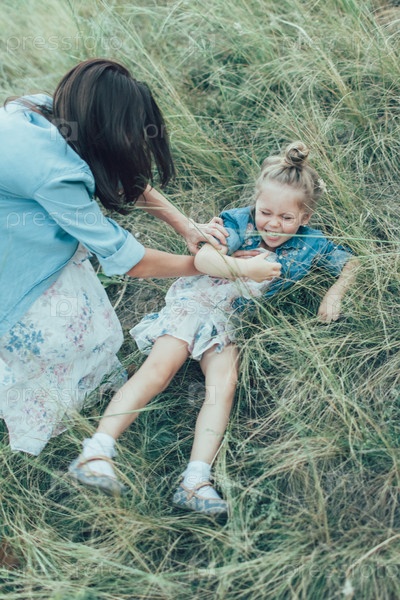 Молодая мать и дочь на фоне зеленой травы