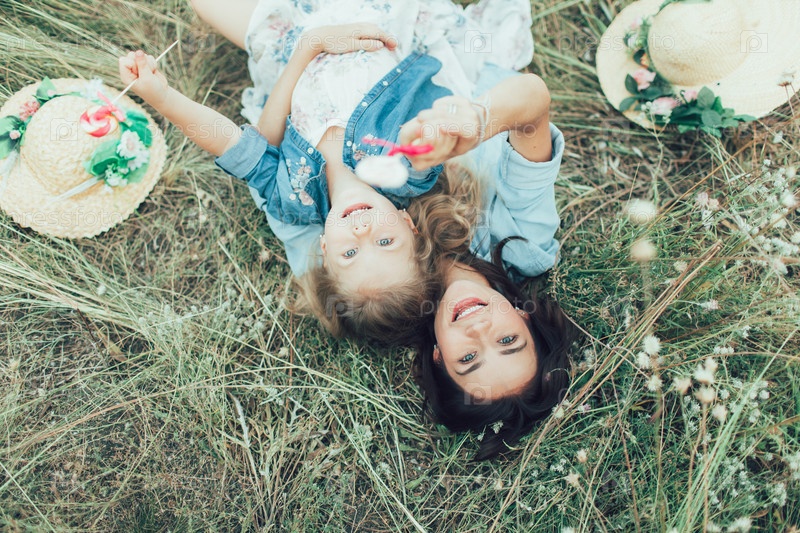 Молодая мать и дочь на фоне зеленой травы