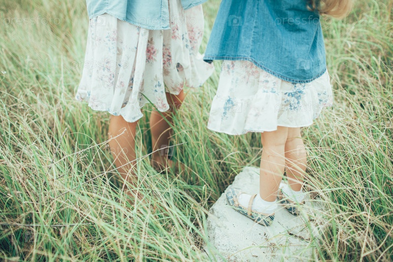 Молодая мать и дочь на фоне зеленой травы
