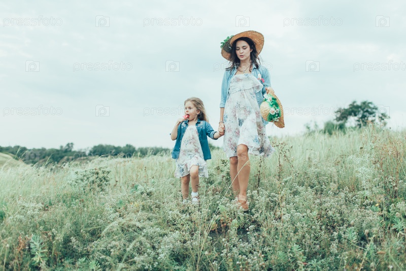 Молодая мать и дочь на фоне зеленой травы