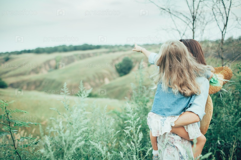 Молодая мать и дочь на фоне зеленой травы