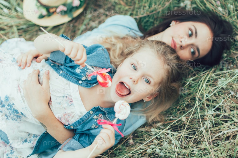 Молодая мать и дочь на фоне зеленой травы