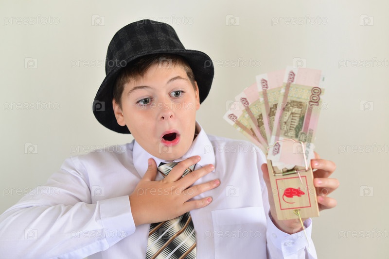 Мальчик в костюме с купюрами в мышеловке