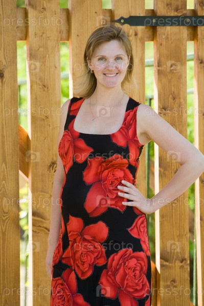 Беременная женщина у деревянного забора