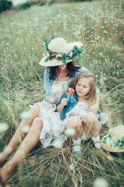 Молодая мать и дочь на фоне зеленой травы