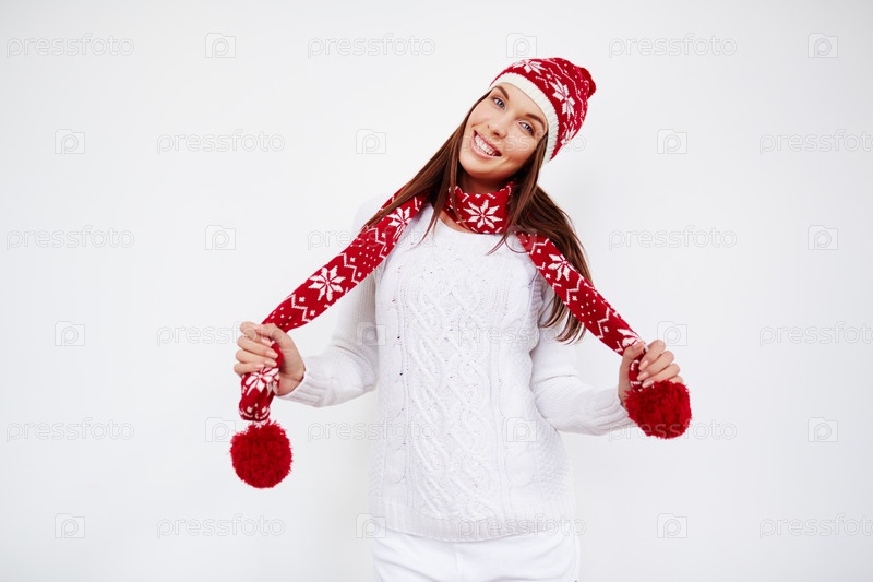 Женщина в красном шарфе и шапке