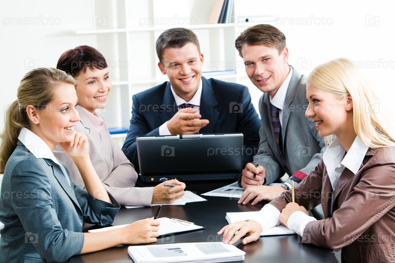 Фото бизнес-группы, сидящей на рабочем месте и смотрящей на успешную женщину, касающуюся бумаг