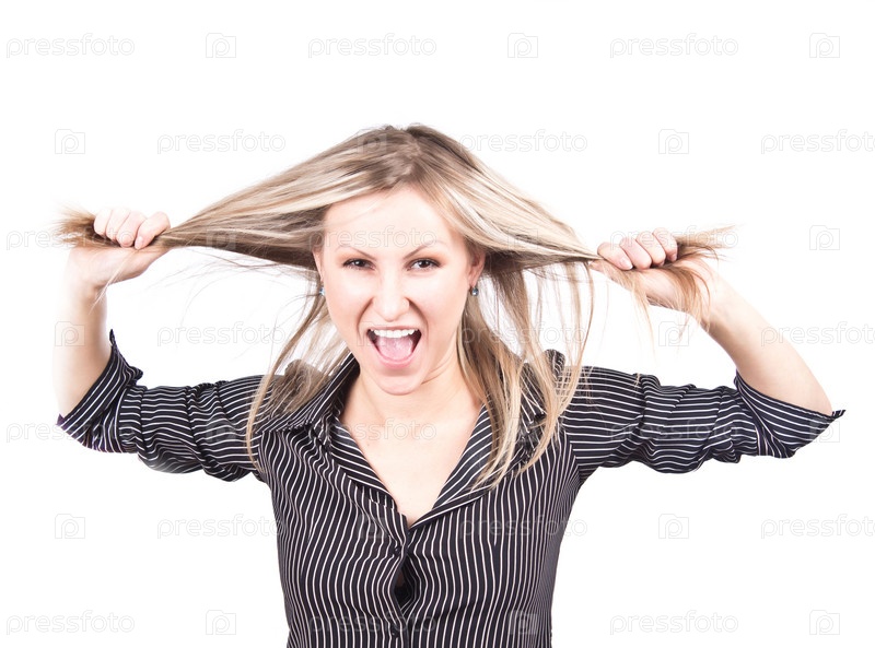 Портрет молодой девушки в ярости на белом фоне