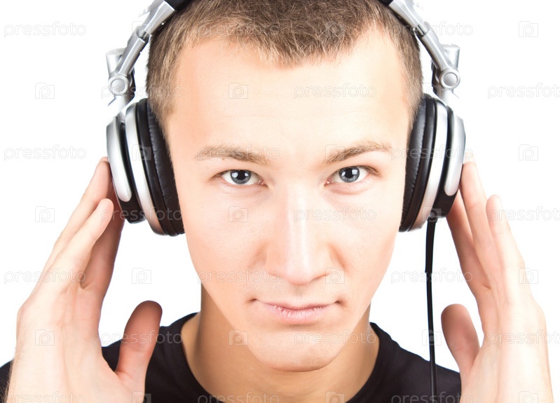 Портрет молодого человека с наушниками на белом фоне