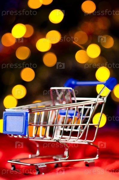 Пустая тележка для покупок на фоне размытых огней на новогодней елке