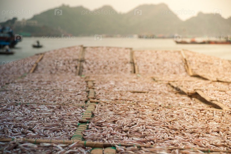 Планты маленьких анчоуса рыбы, сушка на открытом воздухе