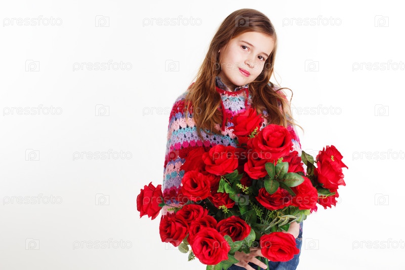 Маленькая девочка держит букет из роз