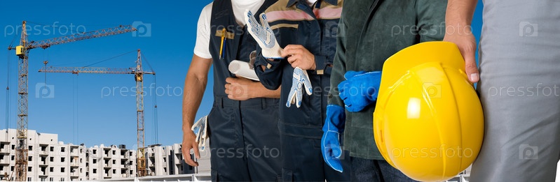 Рабочие на фоне стройки