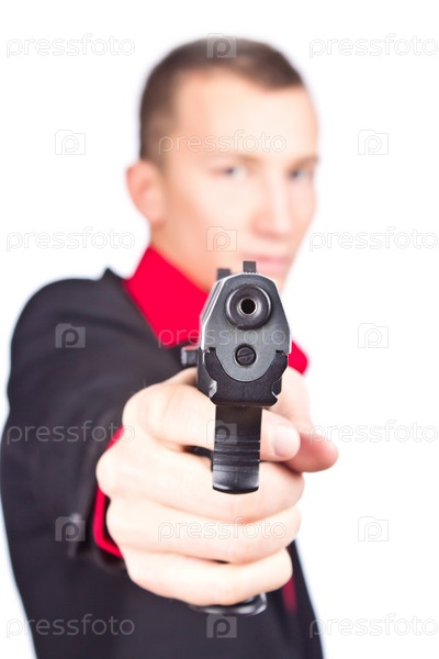Пистолет в руке парня на белом фоне