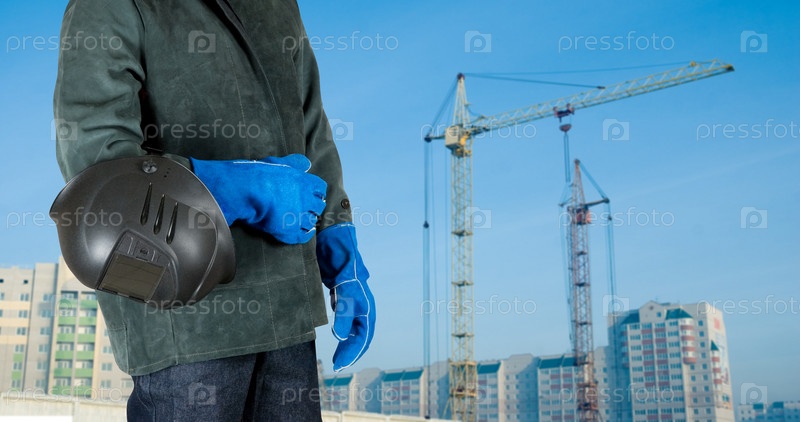 Мужчины крупным планом сварщика со сварочным оборудованием на фоне здания