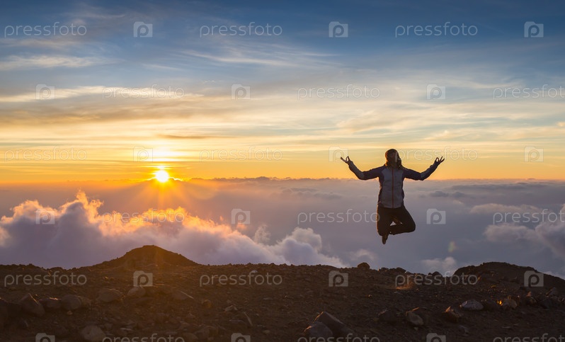 Счастливая девушка прыгает на фоне заката