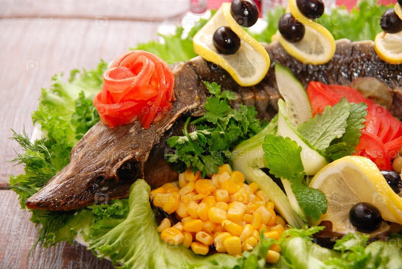 Стерлядь с овощами крупным планом