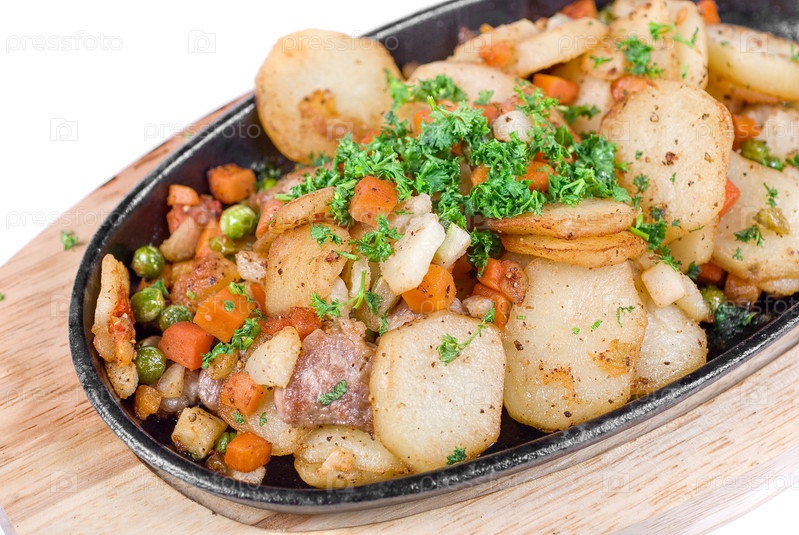 Жареный картофель с мясом и овощами на белом
