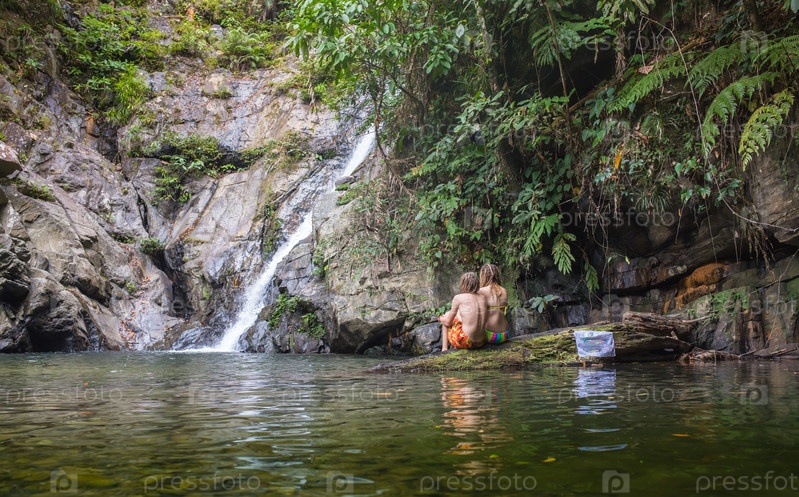 Пара, сидя у водопада