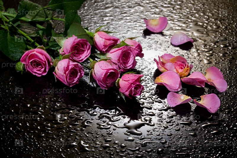 Розы и лепестки на черном фоне