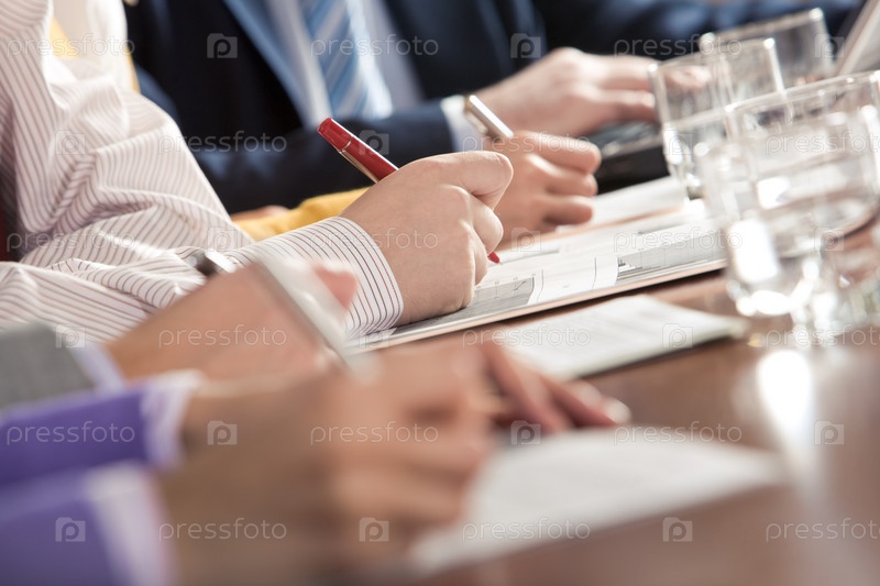 Рука держит ручку и что-то пишет во время лекции или бизнес-семинара