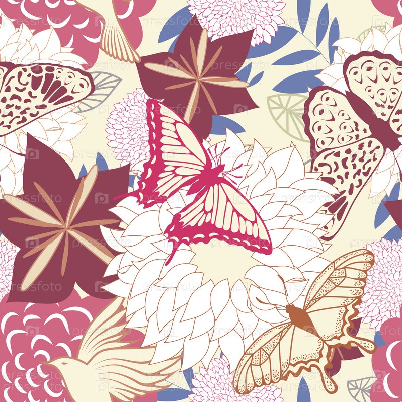 Абстрактный цветочный фон с птицами и бабочками