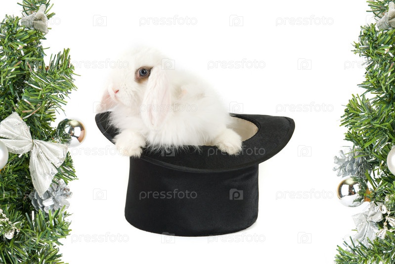 Белый кролик в шляпе фокусника на белом фоне с фрагментами новогодней елки