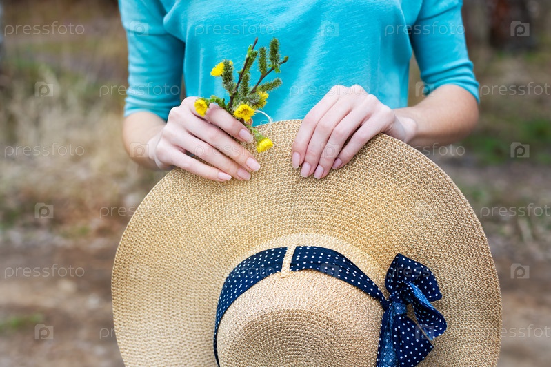 Солома шляпа и весенний букет