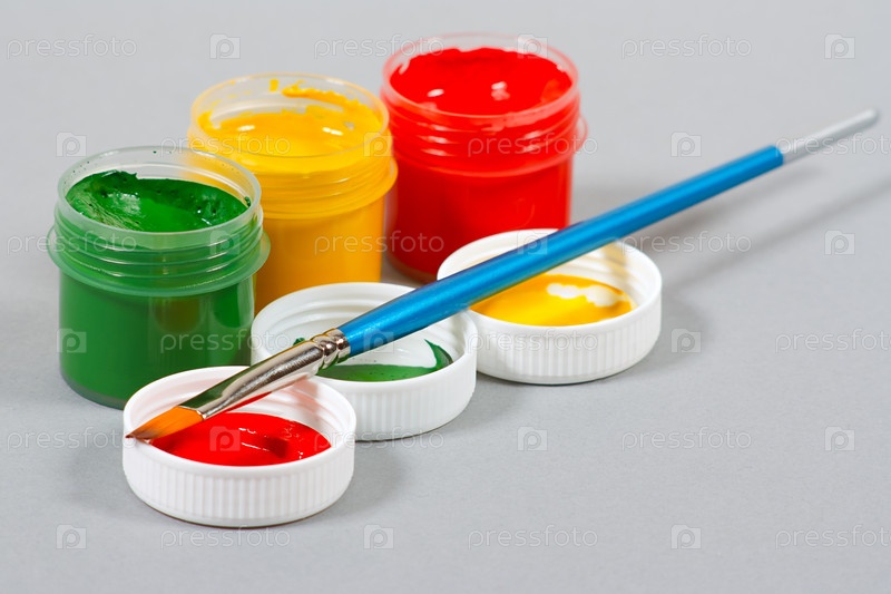 Баночки с цветными красками и кисточка на сером фоне