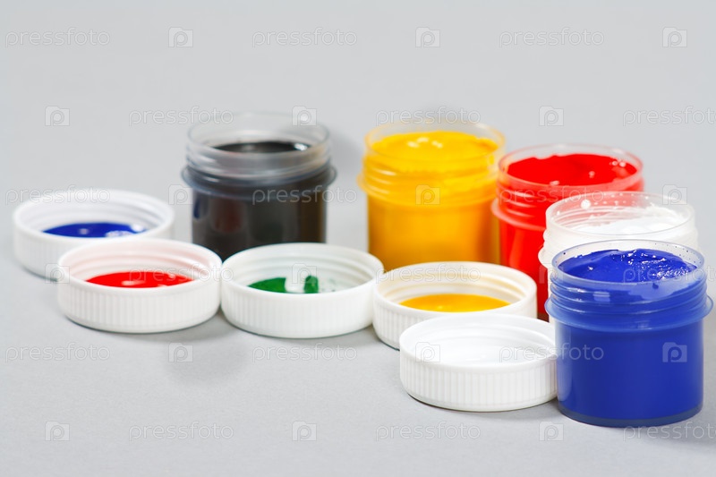Баночки с цветными красками на сером фоне