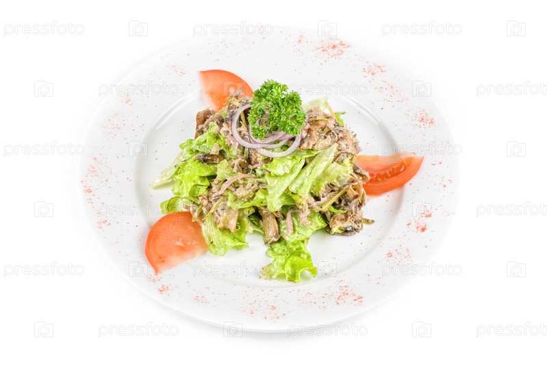 Салат из кальмаров с жареным куриным мясом, яблоками, помидорами, яйцами и перцем