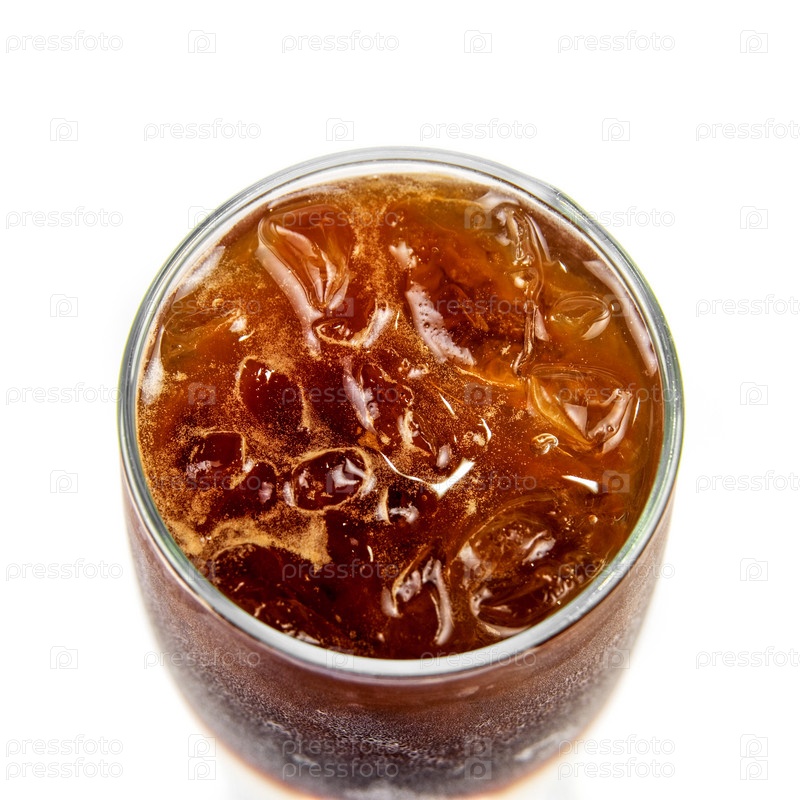 Кола в стакане со льдом крупным планом на белом, вид сверху