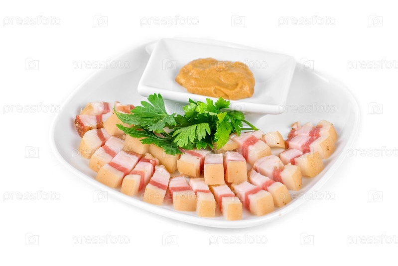 Кусочки свиного сала с зеленью на тарелке