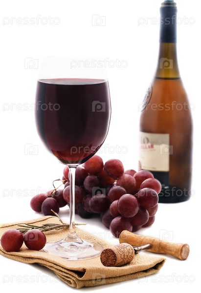 Красное вино в бокале и виноград на белом