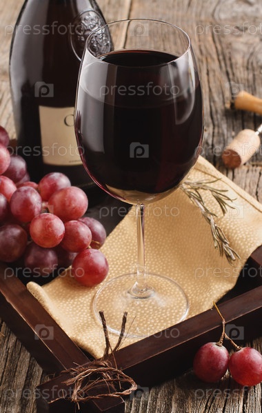 Красное вино и виноград на старинном столе
