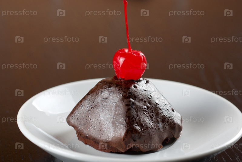 Шоколадный кекс с вишней на тарелке