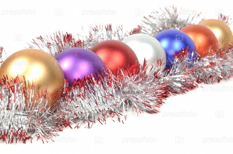 Цветные новогодние шары и мишура на белом фоне