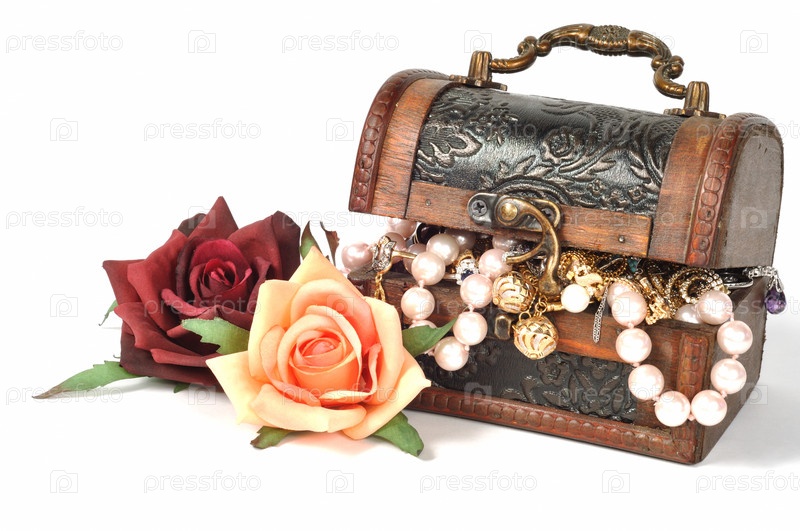 Ювелирные изделия в деревянном сундучке на белом фоне