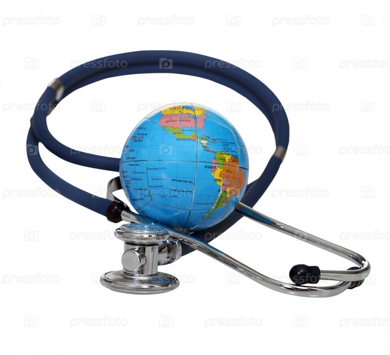Стетоскоп и глобус на белом фоне