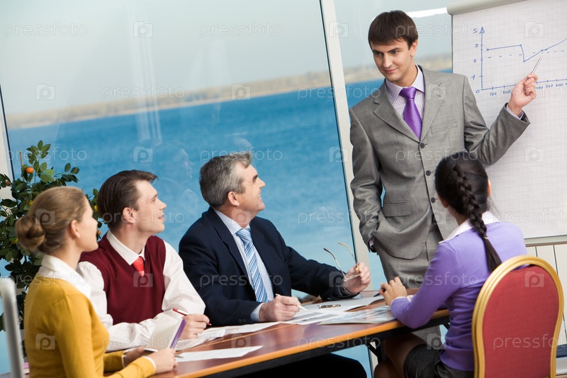 Молодой бизнесмен стоит рядом с доской и указывает на график, показывающий путь к успеху