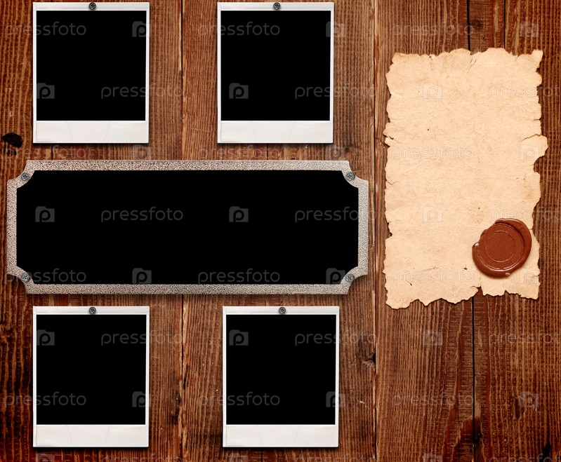 Рамки для фотографий и старая бумага на деревянной стене