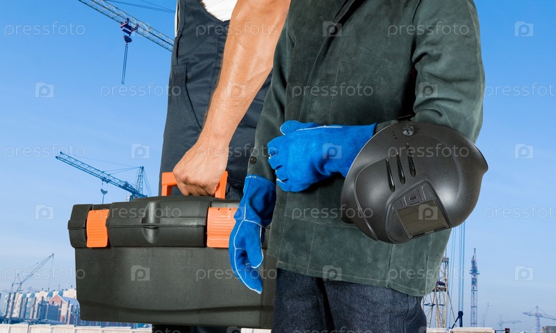 Сварщик и ремонтник на фоне стройки